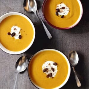 Lauch klein schneiden und anrösten. Kürbis und Kartoffeln schälen, in Stücke schneiden und zum Lauch dazu geben. Mit Wasser aufgießen, salzen und köcheln lassen. Karotten schneiden und ebenfalls zugeben. Gemüse weich kochen und im Anschluss pürieren.