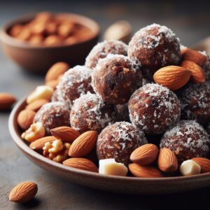 Datteln im Wasserbad einweichen und anschließend im Mixer pürieren. Alle weiteren Zutaten zugeben und zu einer glatten Masse verrühren. Teig in Kugeln formen und schmecken lassen.