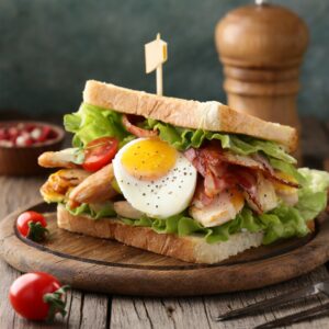 Die Scheiben Toast rösten und anschließend mit Mayonnaise und Senf bestreichen. Hähnchenbrust und Speck anbraten. Alle Zutaten schneiden und auf den Toastscheiben schichten. Nach Geschmack mit Salz und Pfeffer würzen, in Dreiecke schneiden und servieren.